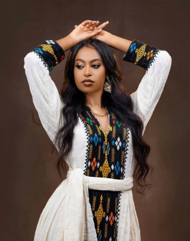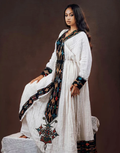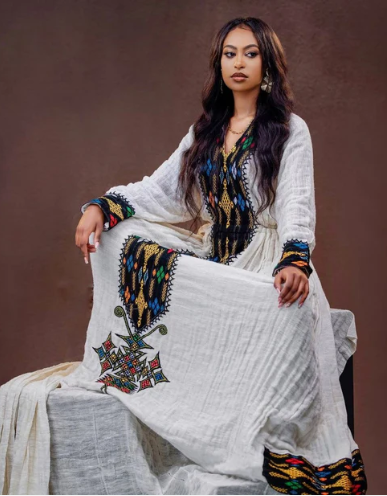 This glamorous traditional Ethiopian dress showcases intricate multicolor embroidery over bold black detailing, adding richness and character to the soft handwoven fabric. A timeless habesha dress ideal for church, cultural ceremonies, and festive occasions. A beautiful choice for anyone who appreciates modern elegance in Habesha clothing.