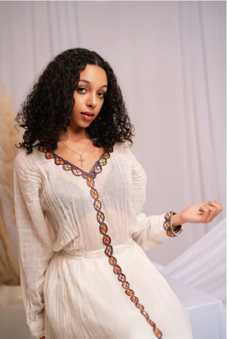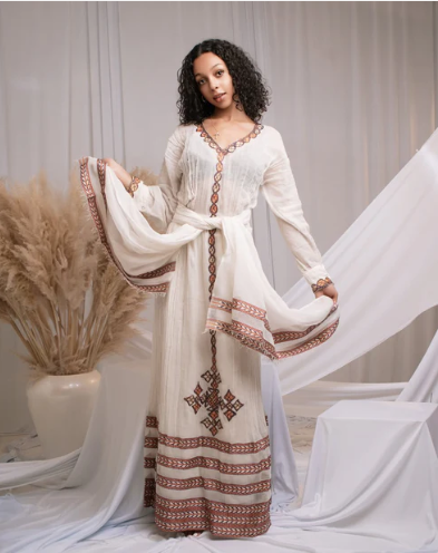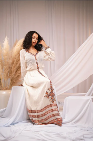 Effortless Elegance: Classic Habesha Kemis with Refined Red Detailing
