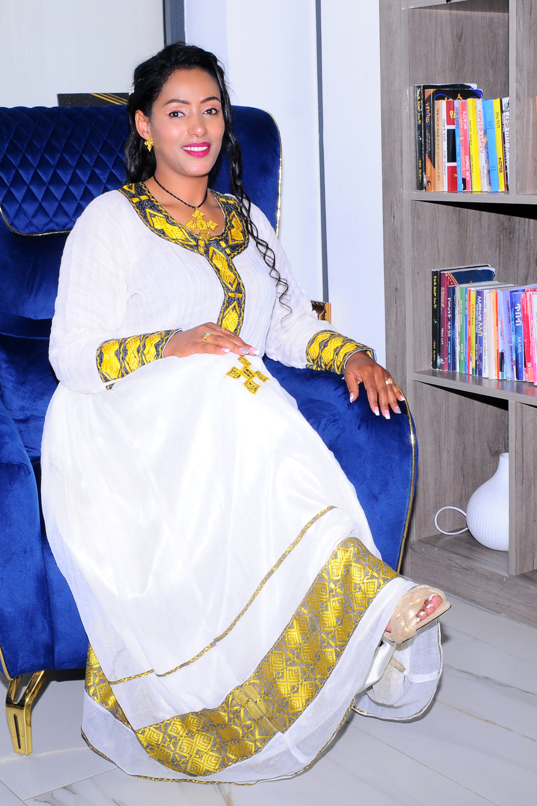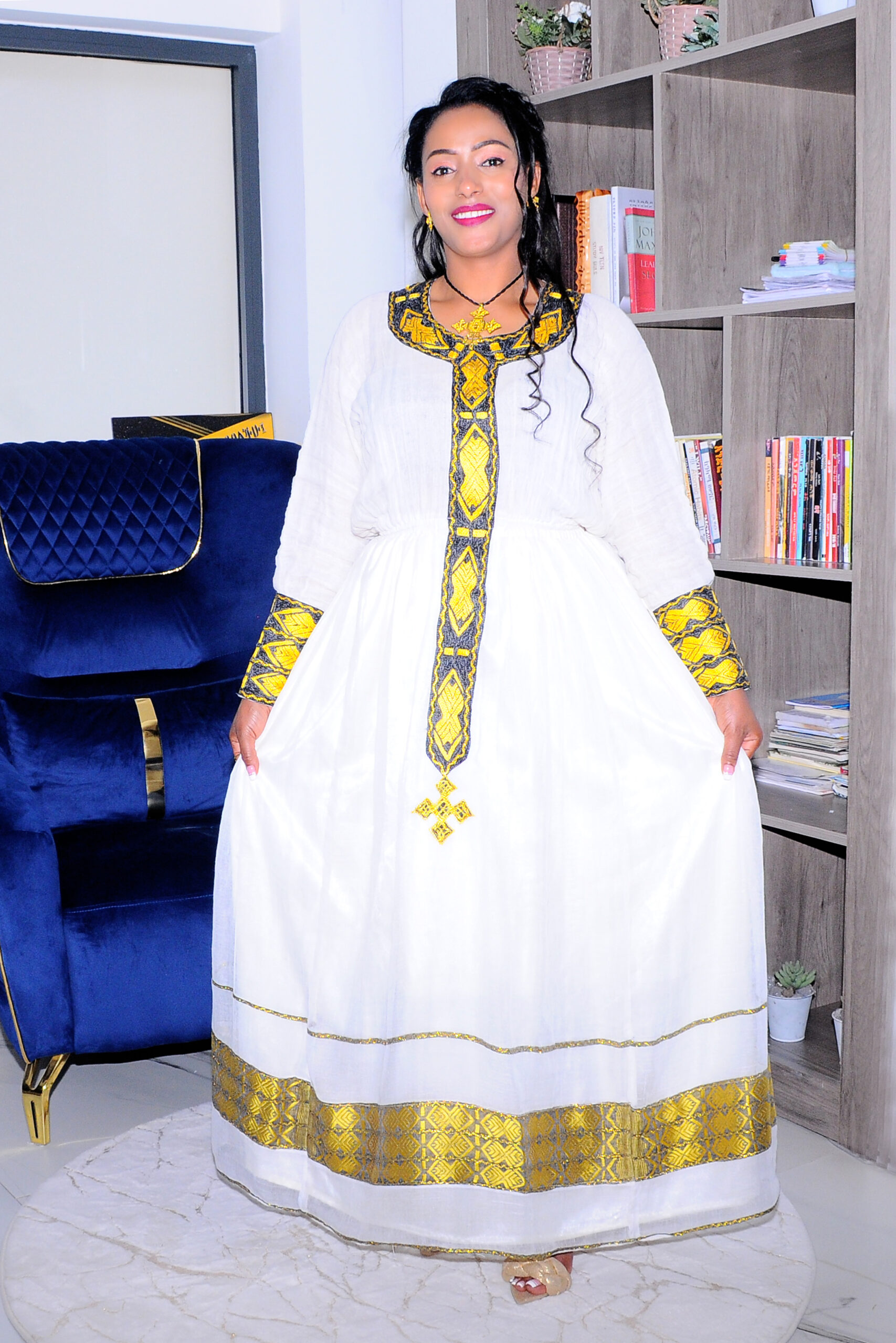 This elegant Habesha dress showcases a soft-toned base highlighted by vibrant golden embroidery on the bodice and hem. Blending classic tradition with a contemporary flair, it’s perfect for festive gatherings and special events. The detailed craftsmanship and graceful silhouette make it a standout piece for expressing personal style while honoring cultural roots.