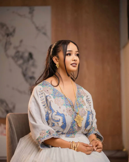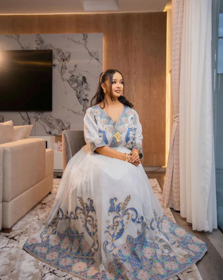 This stunning Habesha dress captivates with its flowing silhouette and uniquely intricate embroidery along the hem and sleeves. The pastel blue and gold tilet design blends floral and geometric elements, creating a luxurious yet delicate aesthetic. Perfect for weddings, engagements, or church ceremonies, this piece is a timeless celebration of Ethiopian heritage with a refined, feminine charm.
