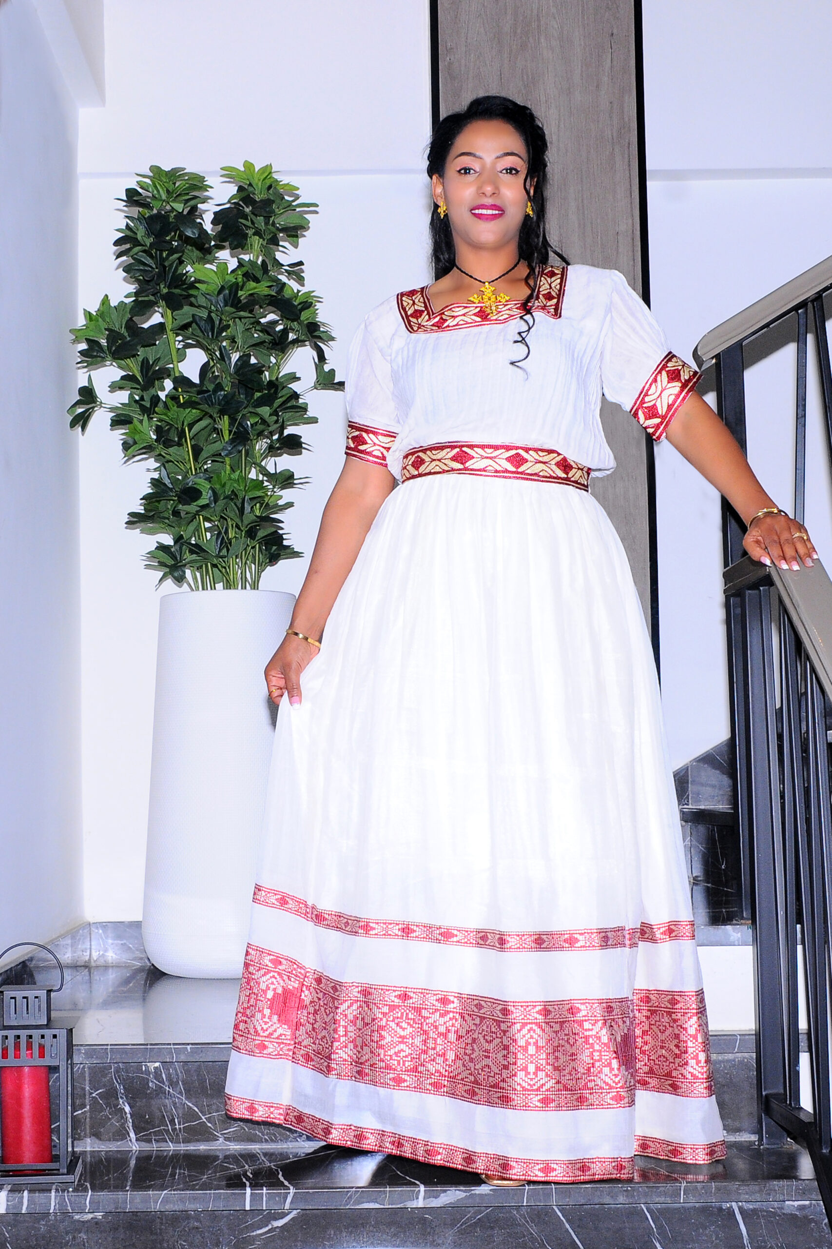 Experience the beauty of the Habesha dress, also known as Habesha kemis, a stunning Ethiopian traditional dress with a modern design. This attire combines contemporary style with traditional elegance, making it perfect for any special occasion.
